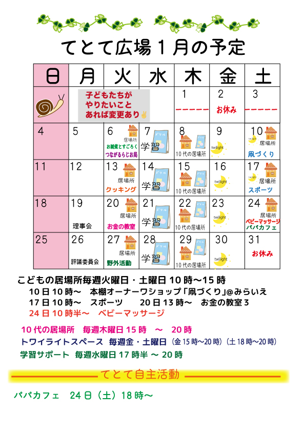1月の予定 Posted on 2025年12月29日 - 10:16 PM by tetote-admin 2026年もよろしくお願いいたします。 活動は変更になることがあるかもしれません。公式ラインからお問い合わせくださいね